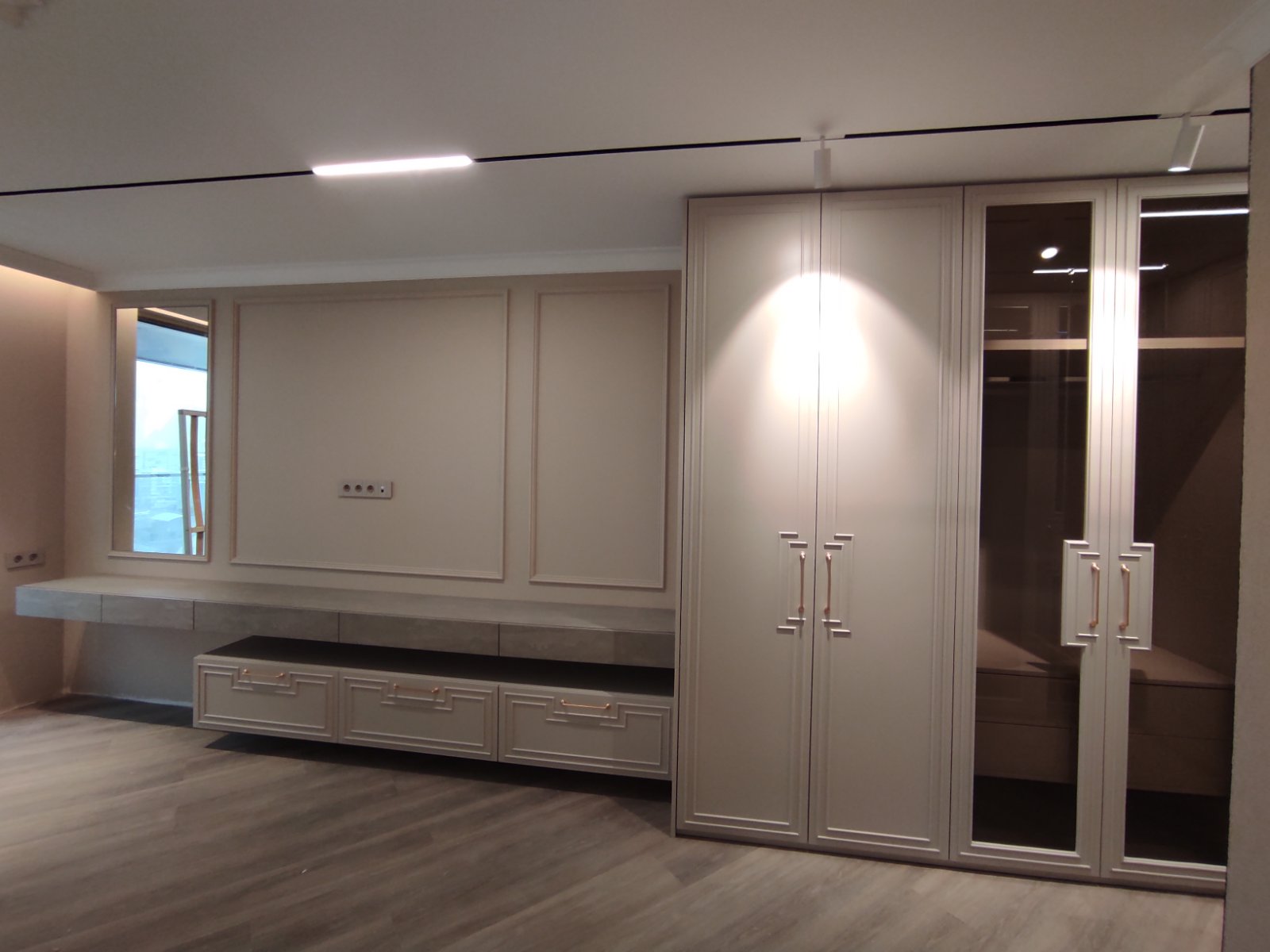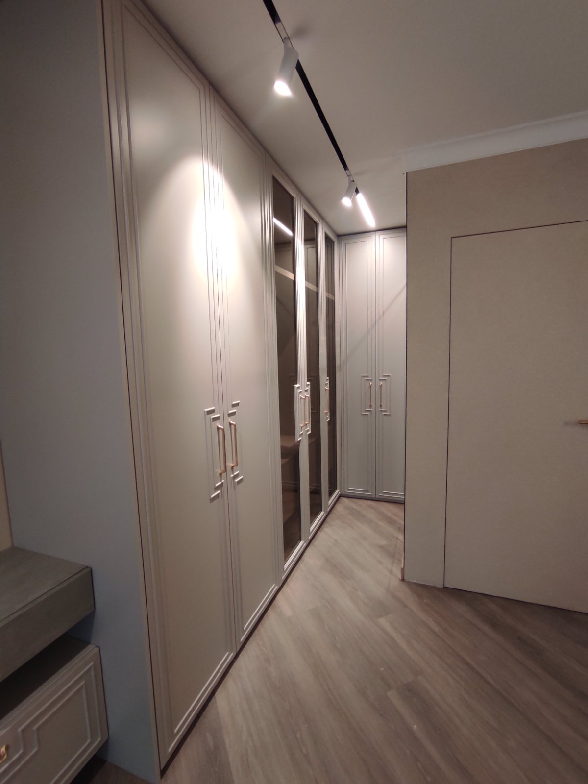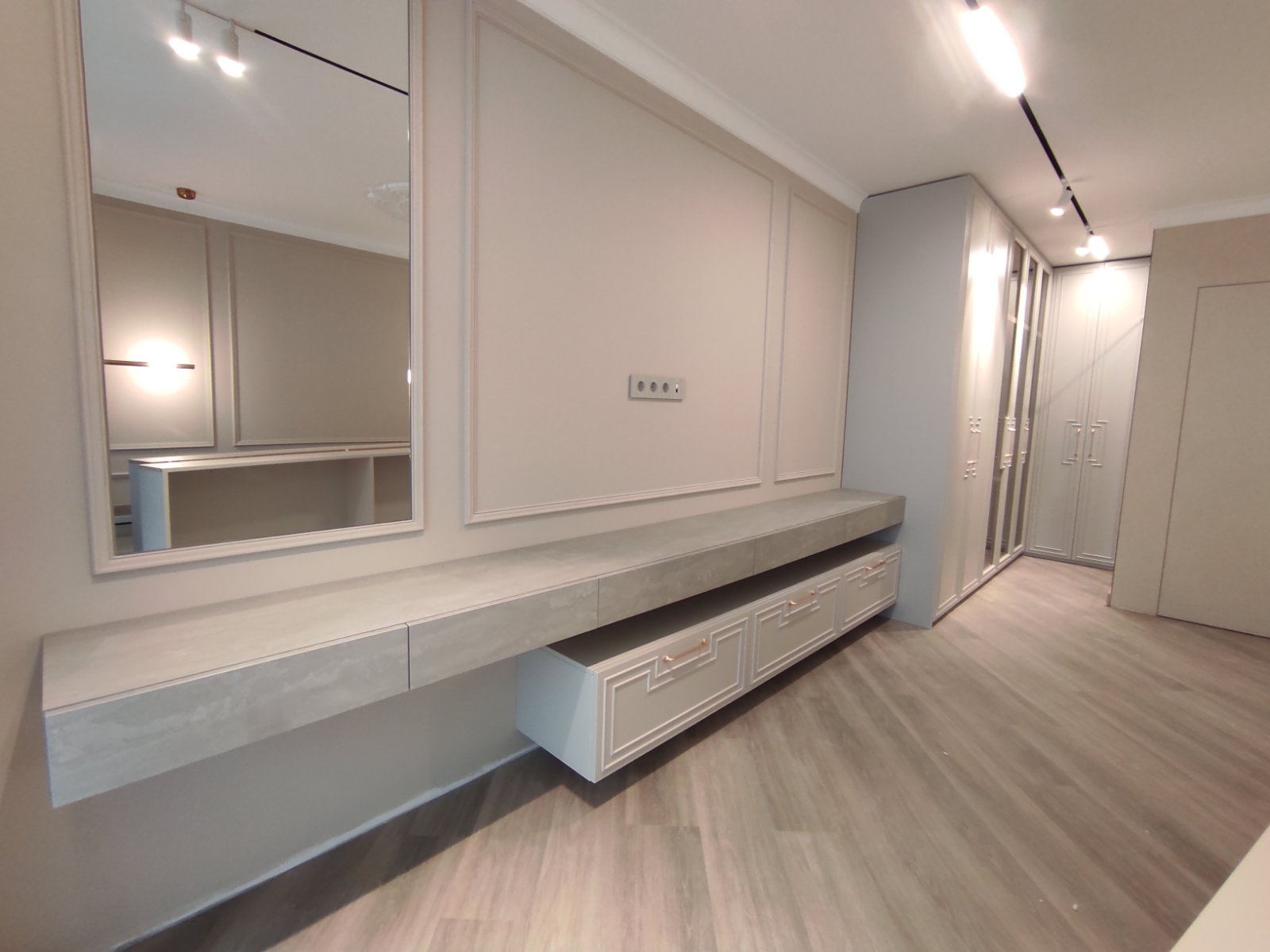 Гардеробите в спалнята са по проект на дизайнерско студио " Паричкова дизайн " . Вратите , както и челата на чекмеджетата са изработени от МДФ боя мат с декоративни профили. Вътре в гардеробите има монтирано LED осветление , което се включва при отварянето на вратите. Някои от вратите са със стъкла бронзе с рамка от МДФ. Вътре в гардеробите, освен обикновенни лостове, има и такива специално за панталони. Плота с чекмеджетата на тоалетката е изработен от ПДЧ с декор сив бетон. Самите чекмеджета се отварят без дръжки .