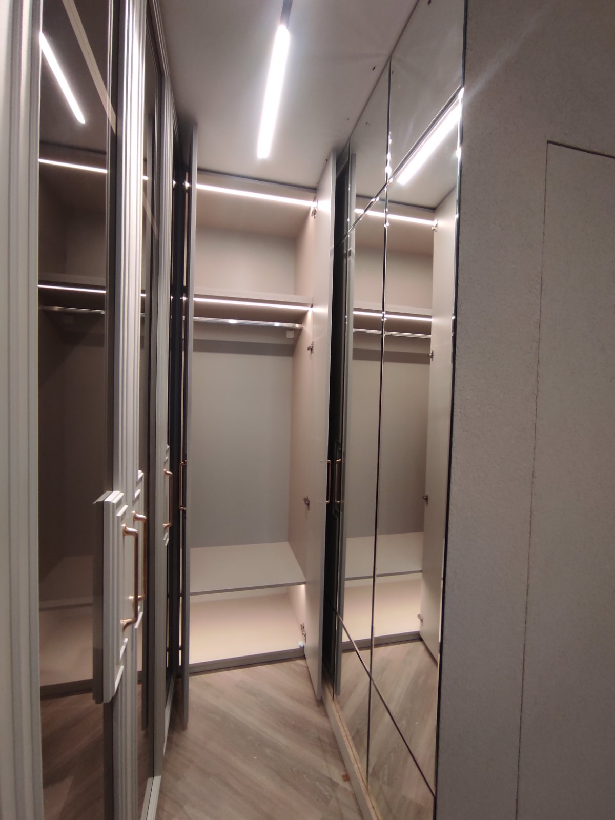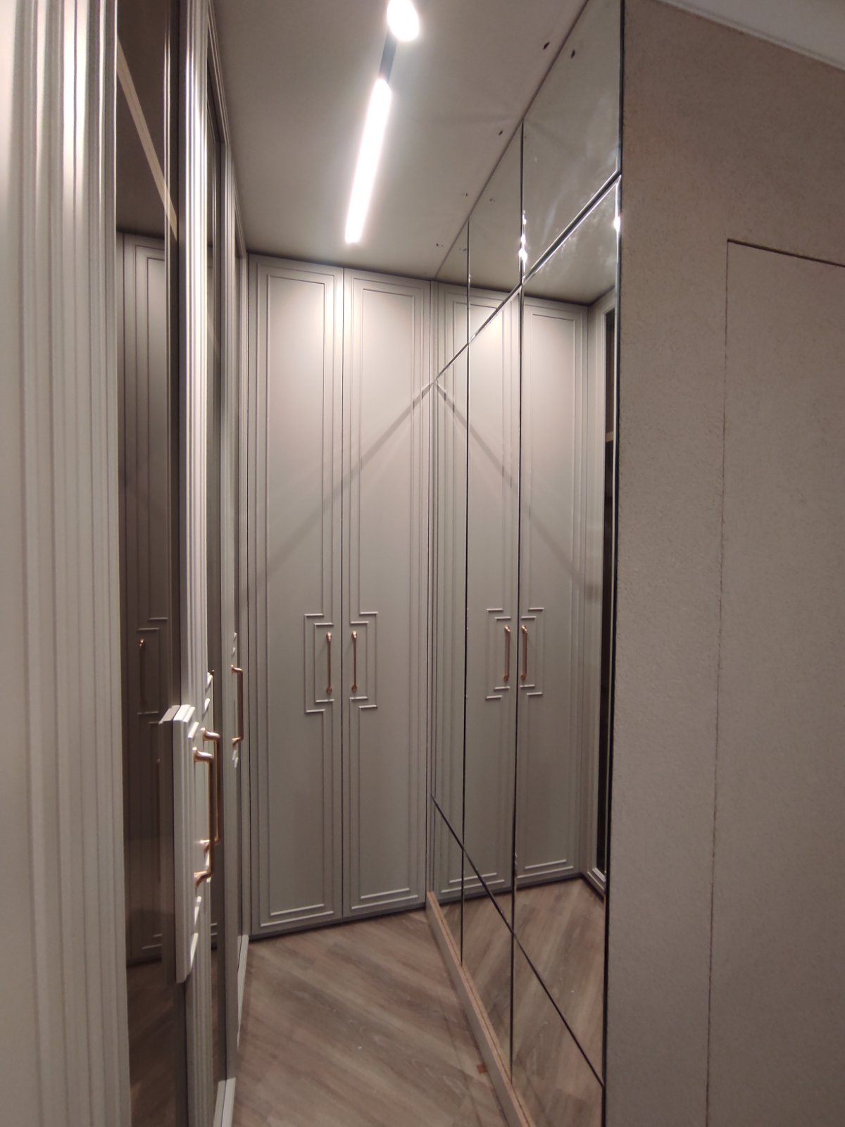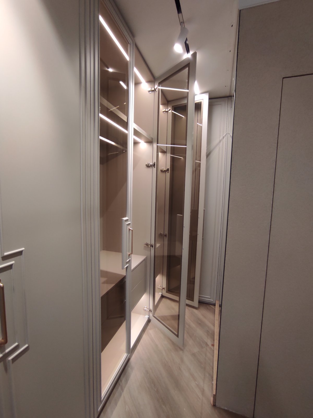 Гардеробите в спалнята са по проект на дизайнерско студио " Паричкова дизайн " . Вратите , както и челата на чекмеджетата са изработени от МДФ боя мат с декоративни профили. Вътре в гардеробите има монтирано LED осветление , което се включва при отварянето на вратите. Някои от вратите са със стъкла бронзе с рамка от МДФ. Вътре в гардеробите, освен обикновенни лостове, има и такива специално за панталони. Плота с чекмеджетата на тоалетката е изработен от ПДЧ с декор сив бетон. Самите чекмеджета се отварят без дръжки .