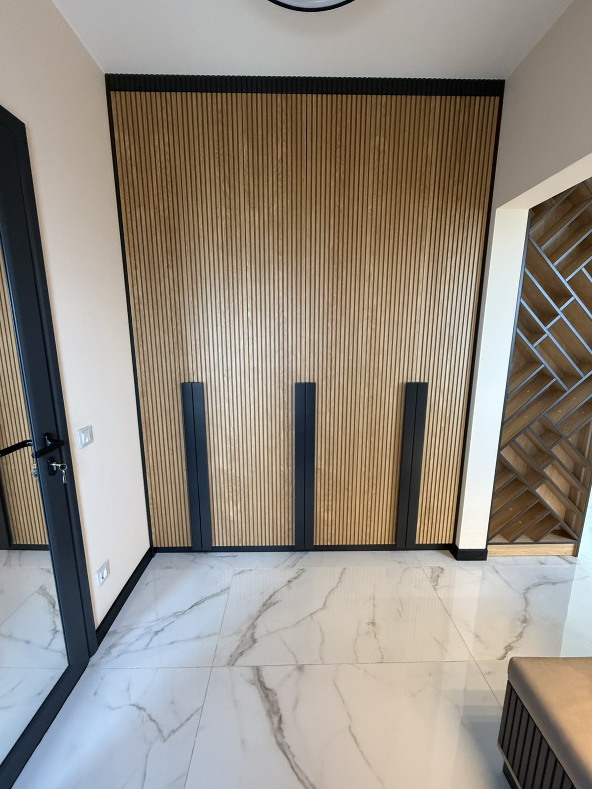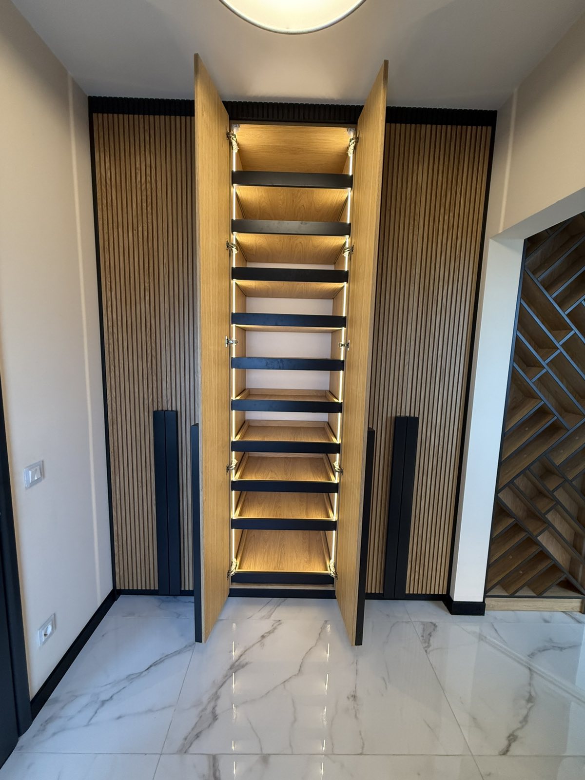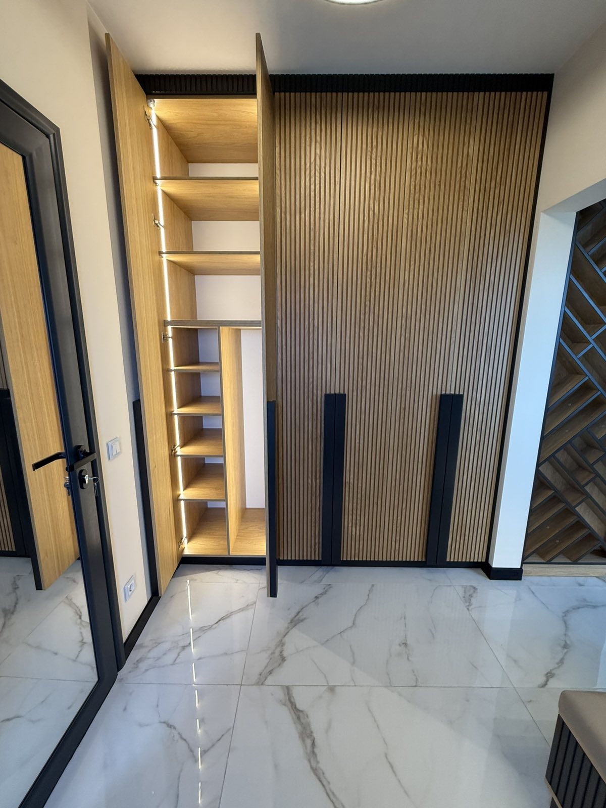 Гардеробите са направени от МДФ фурнир , натурален , лак мат. Вратите са с декоративна фрезовка, а отварянето им е с дръжки изработени също от МДФ с черен цвят. Гардеробите са с вградено LED осветление, което се включва при отварянето на вратите. В черен цвят са и цокъла на гардеробите, и горния корниз. Във входното антре, отстрани на гардероба, има етажерка с декоративно осветление и тапицирана седалка. Зад седалката, ламперията е с ламели от фурнир върху основа от черен МДФ. Интериорните врати също са с декоративна фрезовка , от МДФ фурнир.
