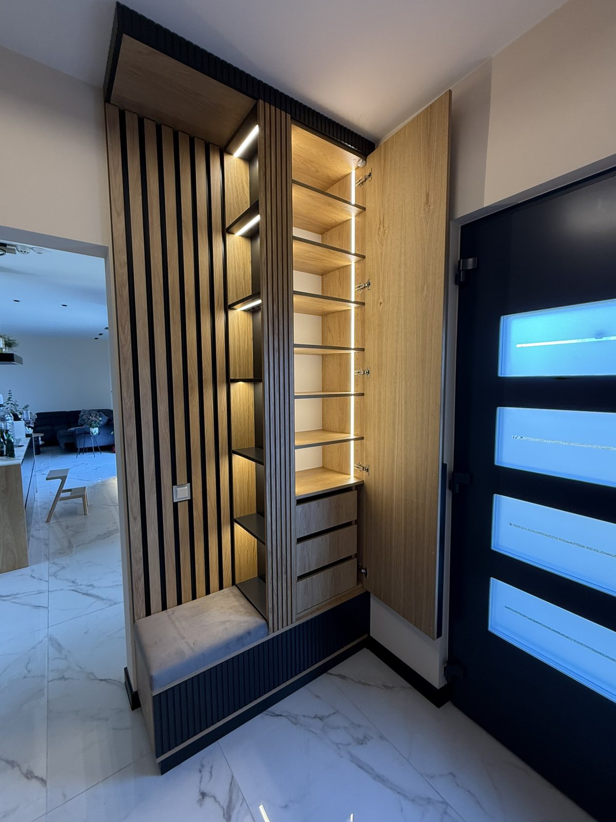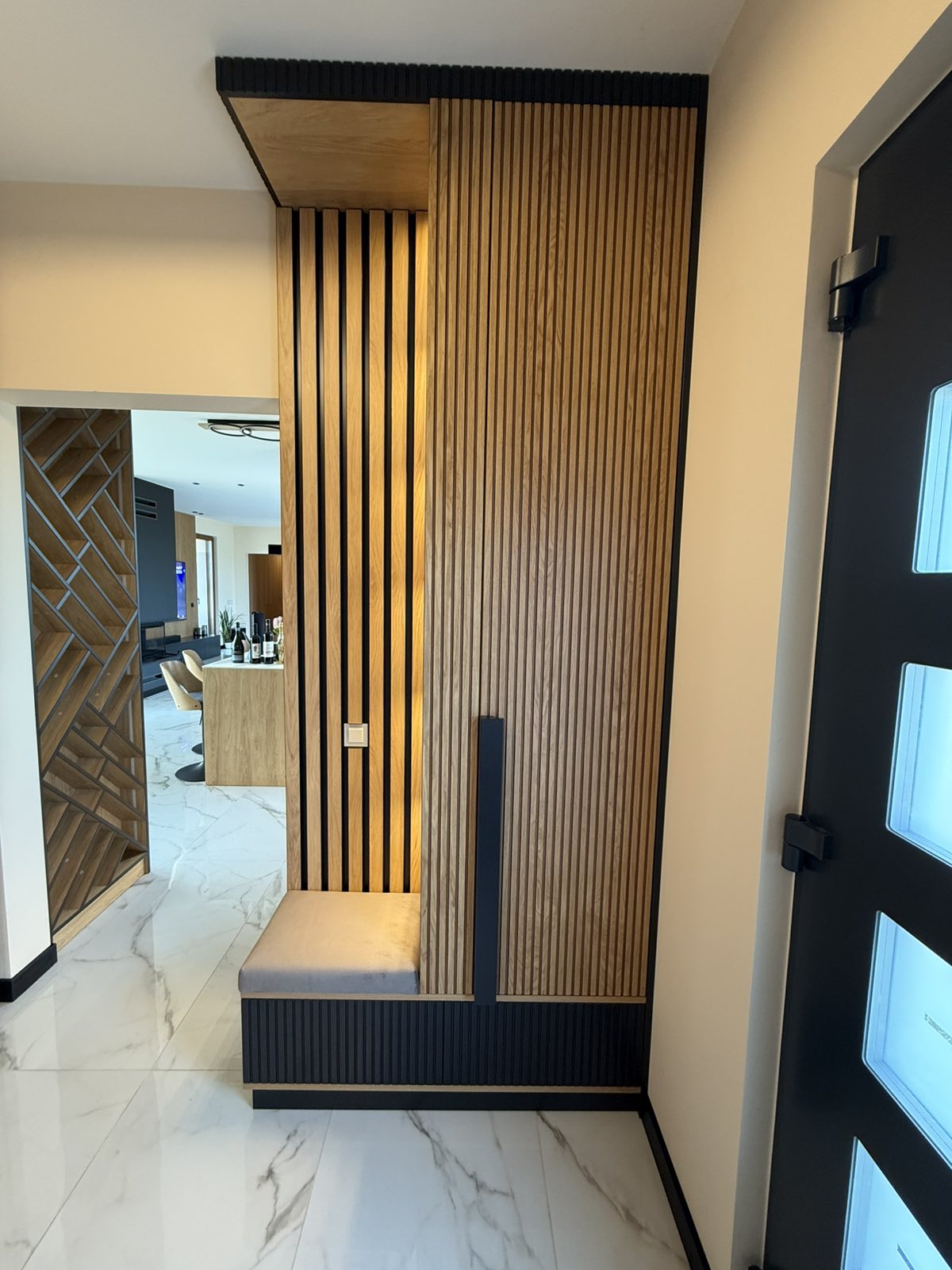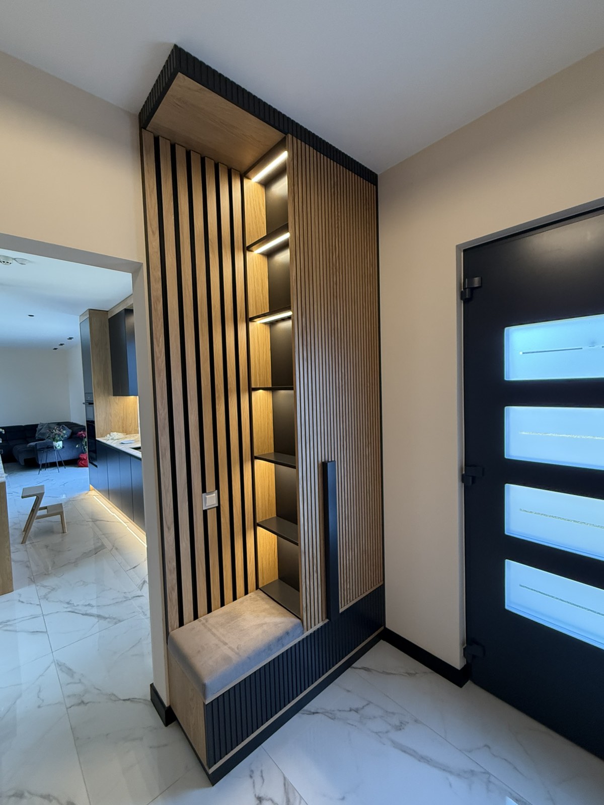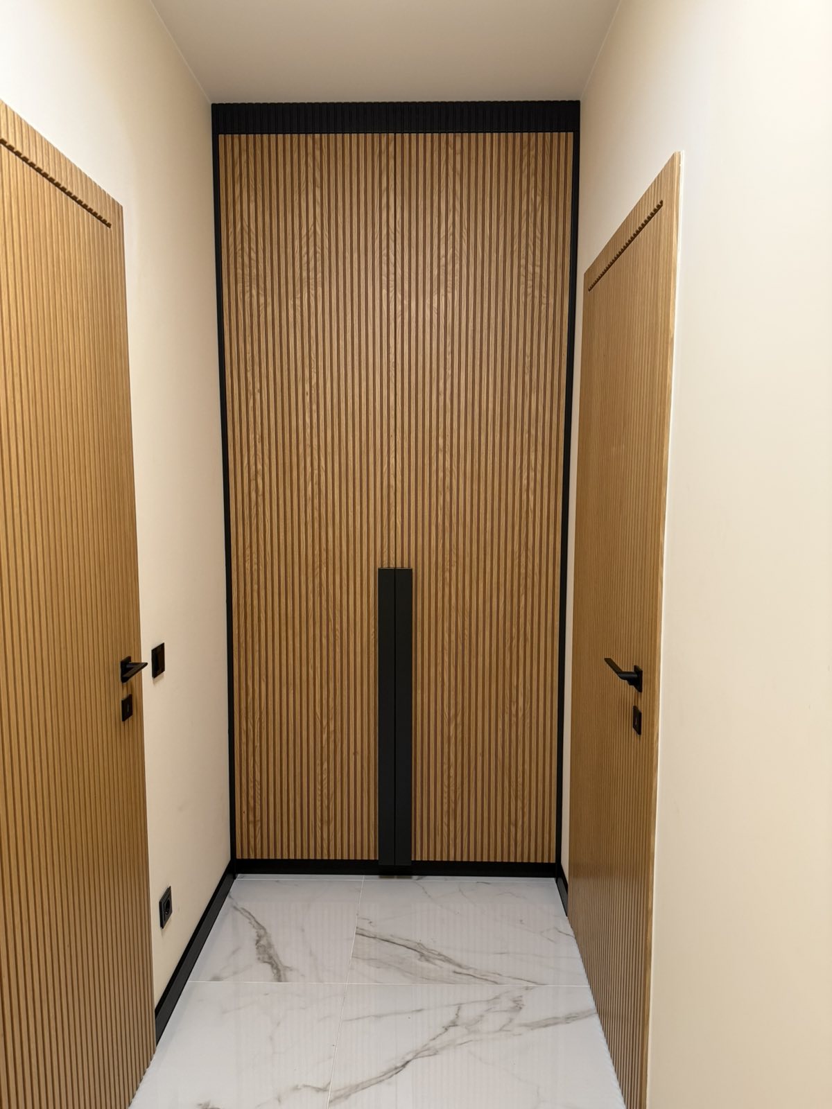 Гардеробите са направени от МДФ фурнир , натурален , лак мат. Вратите са с декоративна фрезовка, а отварянето им е с дръжки изработени също от МДФ с черен цвят. Гардеробите са с вградено LED осветление, което се включва при отварянето на вратите. В черен цвят са и цокъла на гардеробите, и горния корниз. Във входното антре, отстрани на гардероба, има етажерка с декоративно осветление и тапицирана седалка. Зад седалката, ламперията е с ламели от фурнир върху основа от черен МДФ. Интериорните врати също са с декоративна фрезовка , от МДФ фурнир.